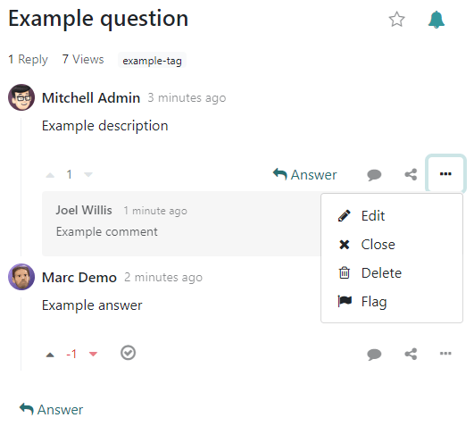 Users can post questions, answer, comment, upvote/downvote, mark answers as best, favorite, follow, share social links, and flag offensive content—all with intuitive UI controls
