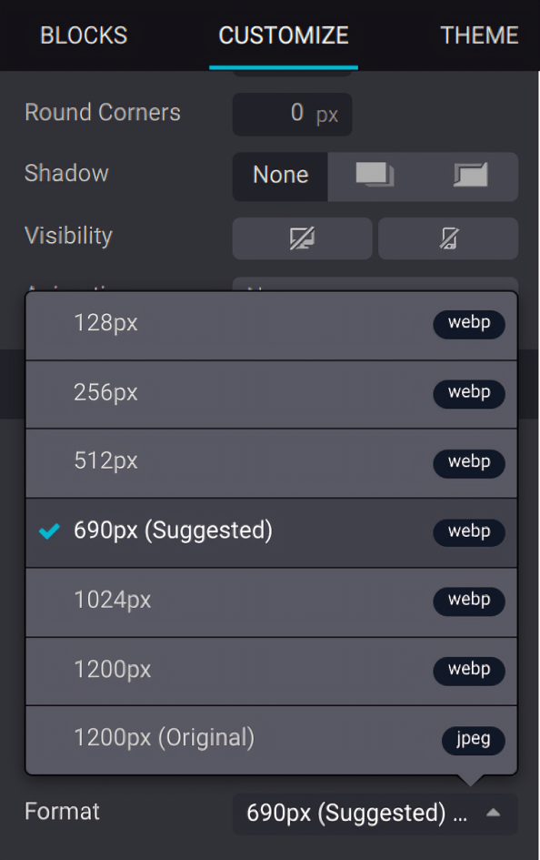 Images are auto-converted to WebP and compressed for fast page loads. Add alt text and configure display settings directly in the editor.
