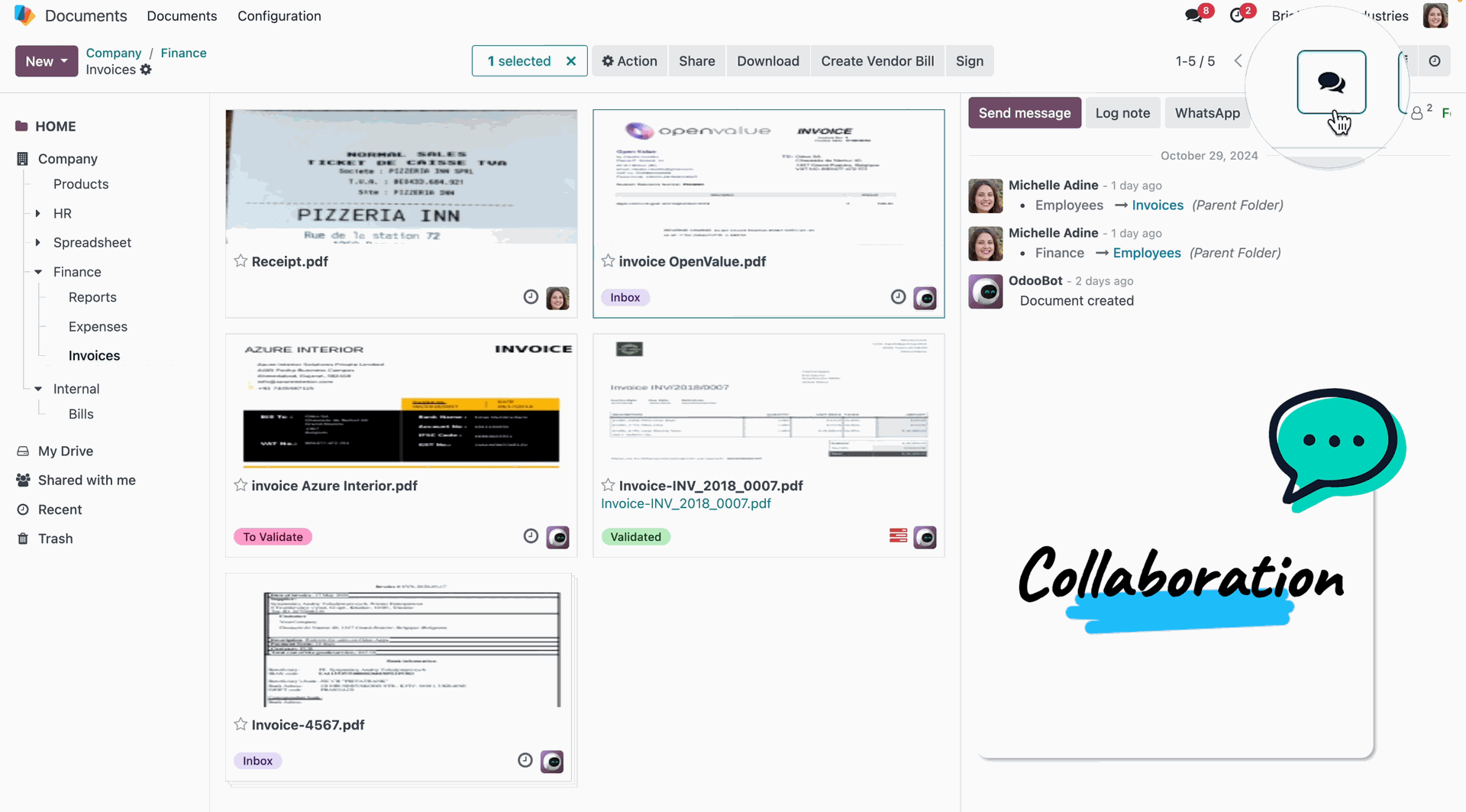 View PDFs, images, videos, spreadsheets inline. Use chatter to collaborate, assign tasks, or add notes without exporting.